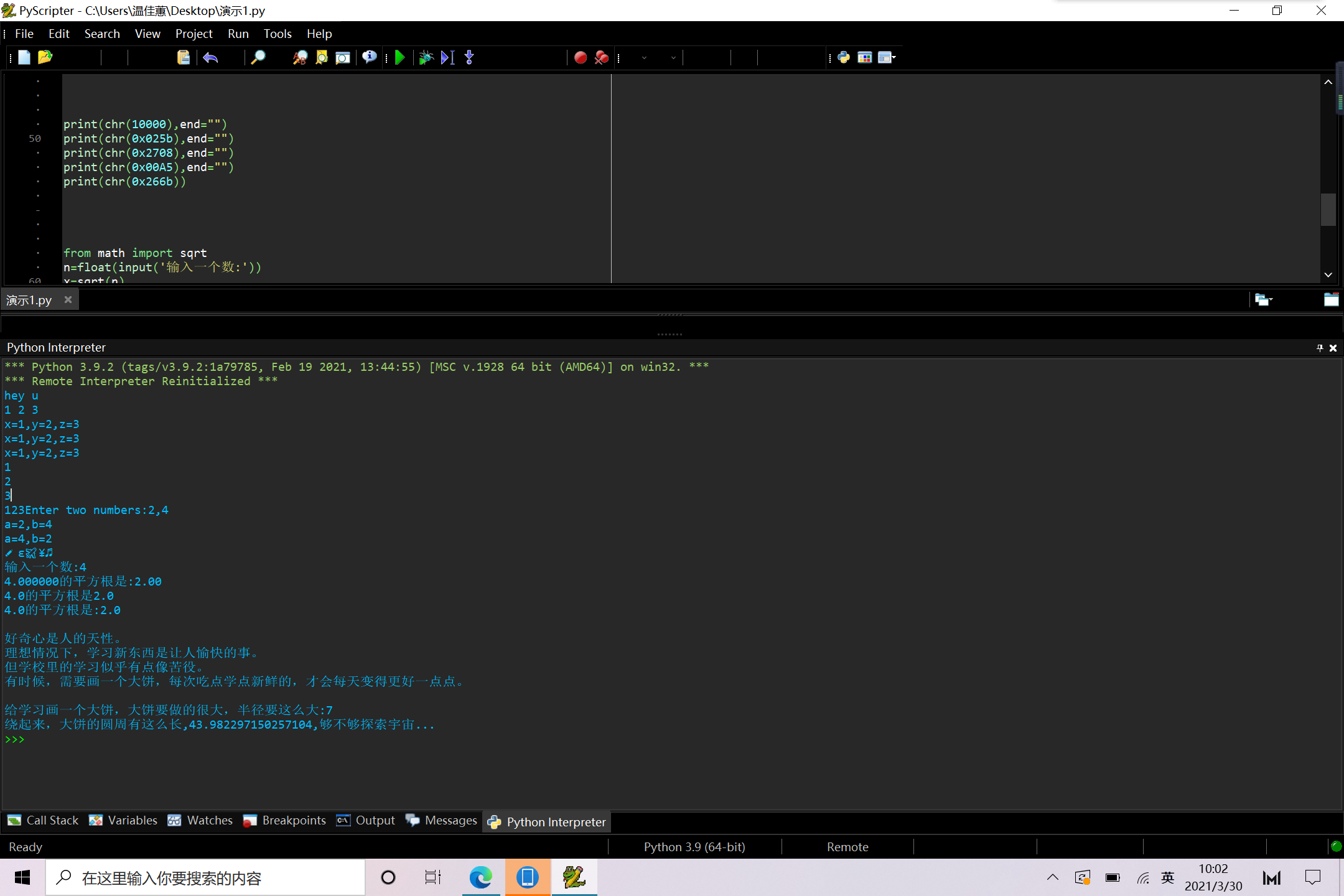 print(f'绕起来,大饼的圆周有这么长,{circle},够不够探索宇宙...')