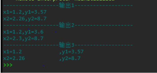 x1,y1=1.2,3.57 x2,y2=2.26,8.7 print('{:-^40}'.format('输出1')) print('x1={},y1={}'.format(x1,y1)) print('x2={},y2={}'.format(x2,y2)) print('{:-^40}'.format('输出2')) print('x1={:.1f},y1={:.1f}'.format(x1,y1)) print('x2={:.1f},y2={:.1f}'.format(x2,y2)) print('{:-^40}'.format('输出3')) print('x1={:<15},y1={:<15}'.format(x1,y1)) print('x2={:<15},y2={:<15}'.format(x2,y2))