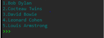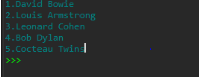 name_list=['david bowie','louis armstrong','leonard cohen','bob dylan','cocteau twins'] name_list.sort() n=1 for name in name_list: print(f'{n}.{name.title()}') n +=1
