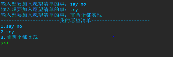 x = [] for n in range(3): a = input("输入想要加入愿望清单的事:") x.append(a) print("{:-^50}".format("我的愿望清单")) for n in range(1,4): print(n,end="") print("."+x[n-1])