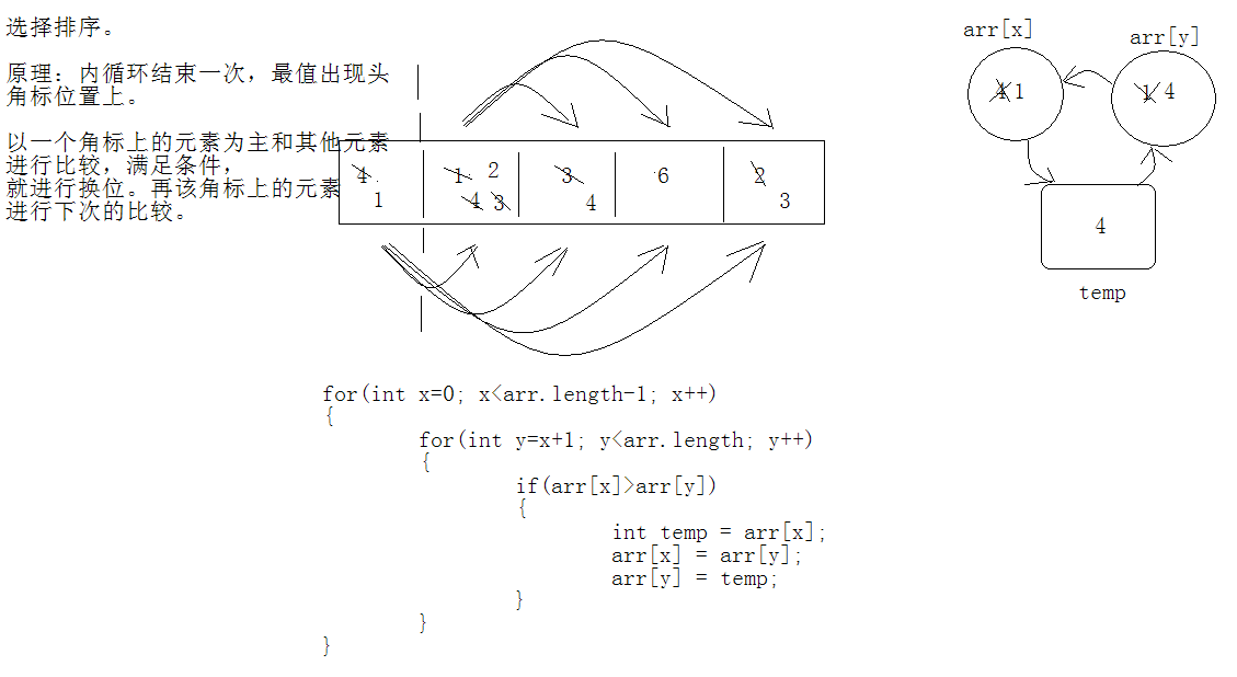 答:以一个角标上的元素为主,依次与其他各元素进行比较,满足条件,就交换位置。第一次循环结束后,最值出现在头角标位置上。以此类推,再用该方式进行下一轮循环,直至形成有序数列。