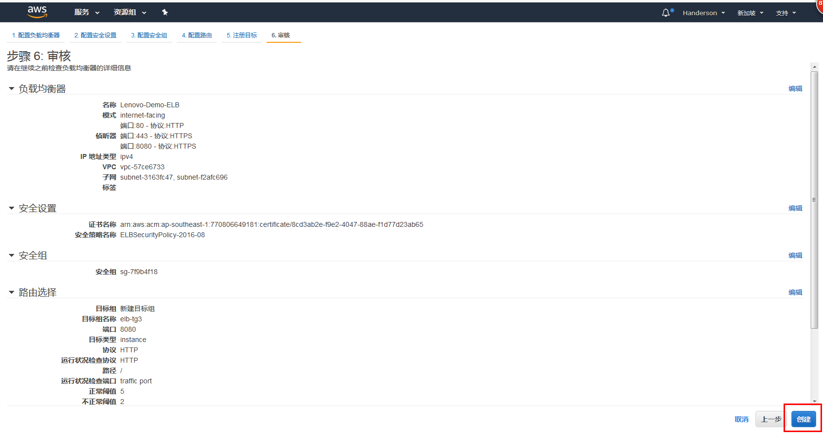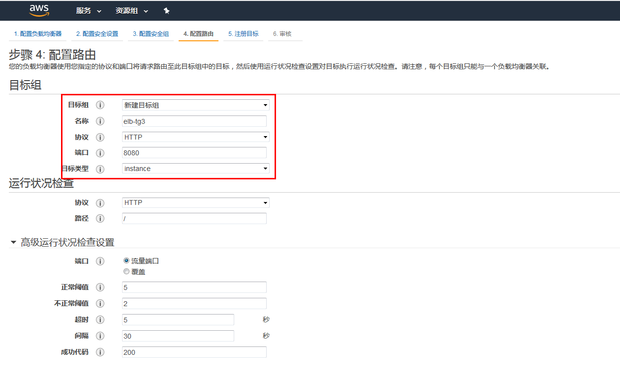(5)配置路由,并新建目标组,把http协议默认端口80改为8080(Load Balancer会将用户请求和流量路由到EC2实例);