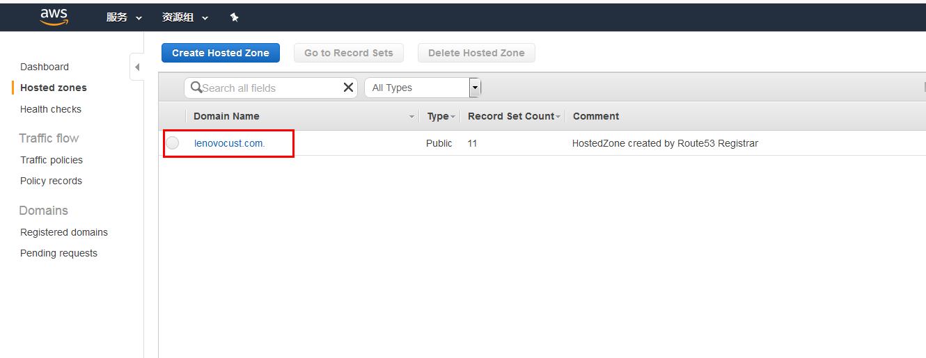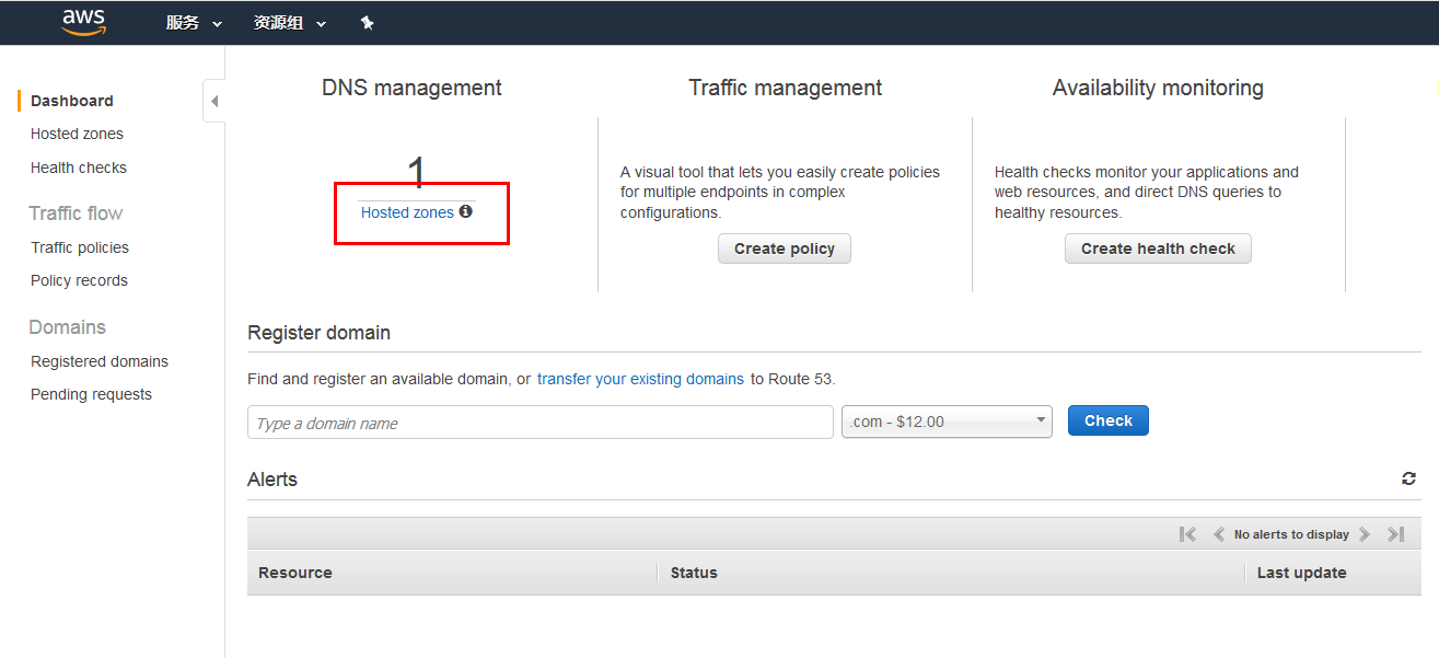 (1)在“Dashboard”页面选择“Hosted zones”连接;