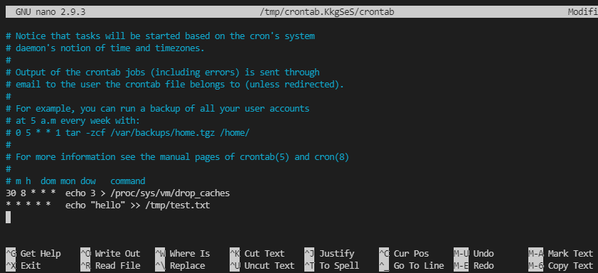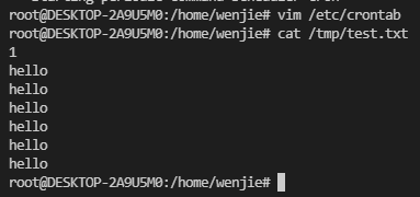 第二行白字表示每星期每月每日每时每分输出字段 "hello" 到 /tmp/test.txt 文件里。