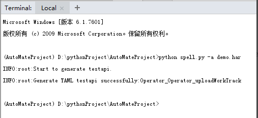 4:打开Terminal,输入命令python spell.py -a demo.har,这个执行完成后会在api目录生成一个以url 路径为名的yaml文件,不要删除demo.har后面生成testcase测试用例会用到。
