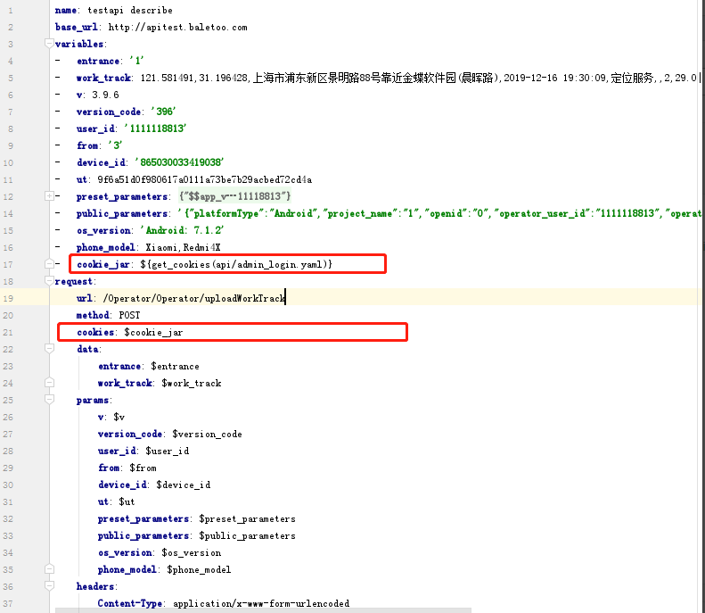 2:先准备录制好登陆接口,在api文件的variables中调用debugtalk.py文件中get_cookies函数(传入登陆接口文件的路径) ,赋予一个变量cookie_jar(可以赋予,可以不赋予直接调用),然后在api文件request中加上cookies字段引用上面的cookie_jar变量,注意这个函数比较特殊一定要传入能拿到cookies接口文件,其它文件就报错了, 用法比较严格