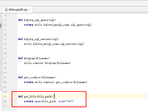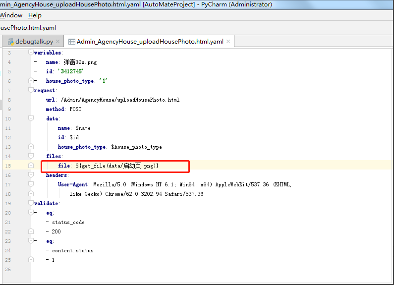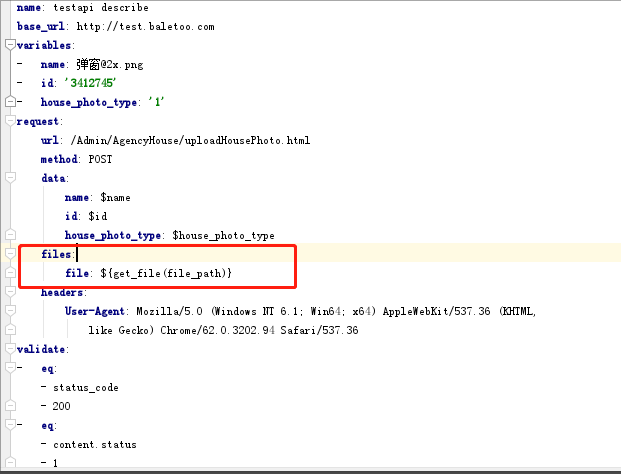 files(固定语法)字段专门用来上传文件,对一个字典格式,img上传文件请求的参数名,open(“文件路 径”, “rb”)是一个以二进制读的方式打开一个文件,返回一个对象(文件句柄)。如果有多个上传文件请求的参数的话也会将其存到该字典当中。注意看我们生成的yaml文件file:是调用一个函数,也就是说我们必须在debugtalk.py文件中写入一个函数如图