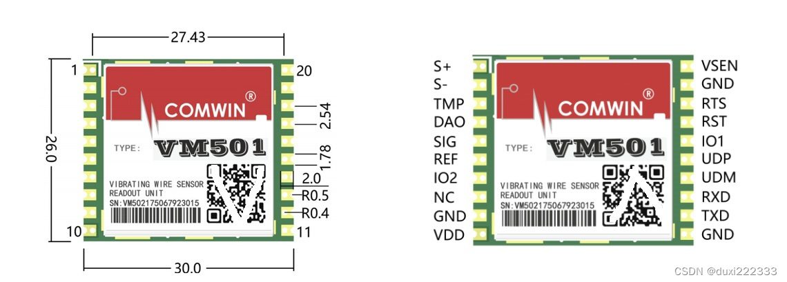 VM501系列模块是单振弦式传感器激励、 频率读取、 温度转换的专业化读数模块,具有集成度高、 体积小、精度高、适应能力强、极少的外围电路设计等突出特性,具有多种激励方法、传感器接入检测、可编程激励电压、信号幅值检测和信号质量评定等先进功能。