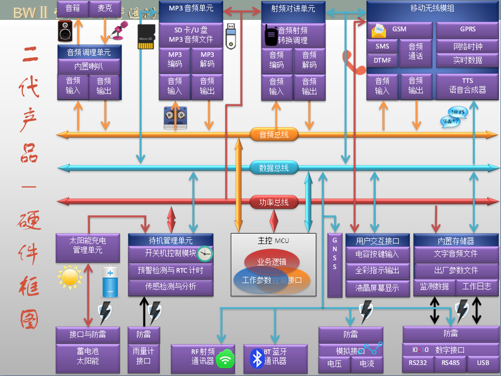 BWII 型广播监测仪由一台主站和若干从站组成(标准配置为一个主站三个从站)。主站集成有传感转换、计时控制、电源控制、存储器、MP3 音频录音播放、TTS 语音合成电路、射频、蓝牙、无线对讲、GSM/GPRS 等功能模块,在中央处理器统一协调下根据预警逻辑算法完成传感数据检测、远程发送监测数据与交互、现场广播预警音频发送等工作;从站负责监听来自主站的预警指令,控制预警设备进行声光现场预警,从站具有大电流继电输出,可由用户扩展连接报警设备。
