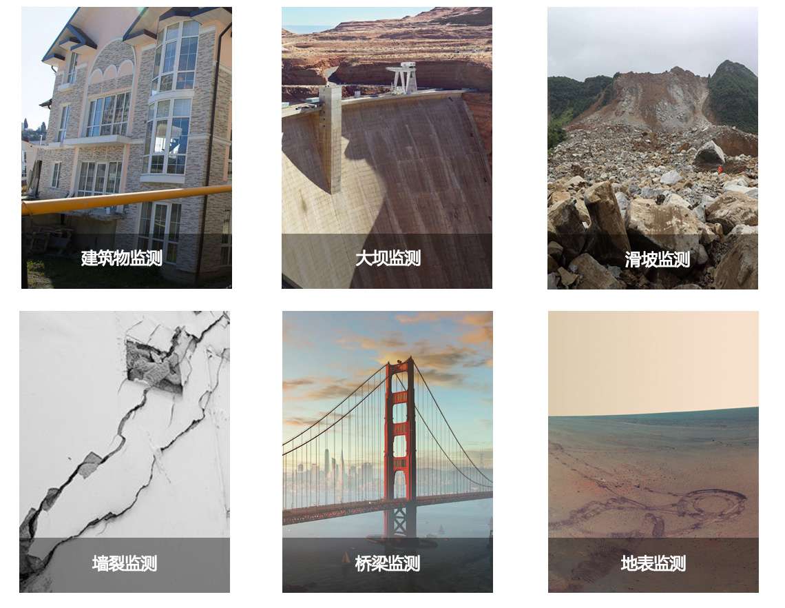 建筑物监测,大坝监测,滑坡监测,墙裂监测,桥梁监测,地表监测。
