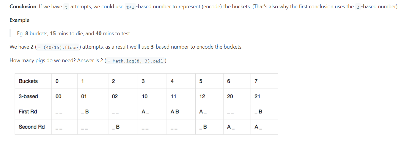 class Solution { public int poorPigs(int buckets, int minutesToDie, int minutesToTest) { int t = (int)Math.floor(minutesToTest/minutesToDie); return (int) Math.ceil(Math.log(buckets) / Math.log(t + 1)); } }