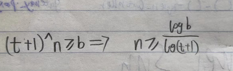 有b个桶,里面有且只有一个装满毒药,猪猪喝了就翘jiojio,每次检测需要t1分钟,总共检测时间有t2分钟,所以总共检测Math.floor(t2 / t1)次,问最少用几头猪猪可以检测出来毒药。