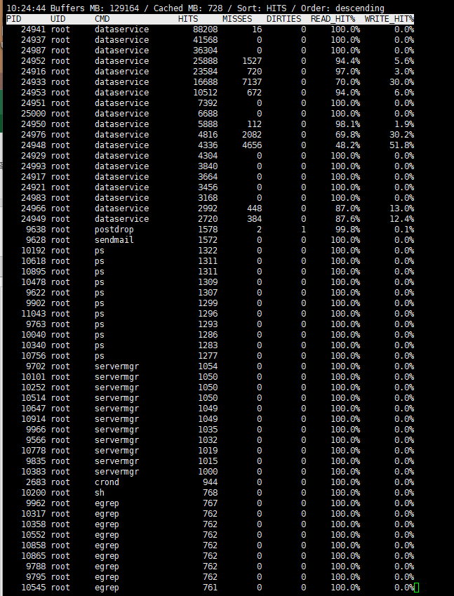 HITTS:命中次数,MISSES:缓存未命中次数,DIRTIES:新增到缓存中的脏页数,READ_HIT%:读命中数,WRITE_HIT%:写命中数