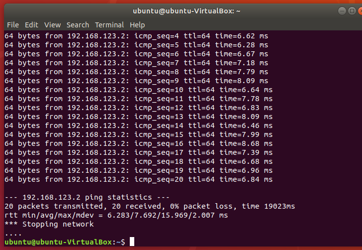 重新运行 Mininet 脚本 mymininet3.py,20 秒时间的 ping 过程中有 icmp_seq 为