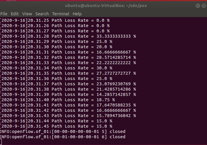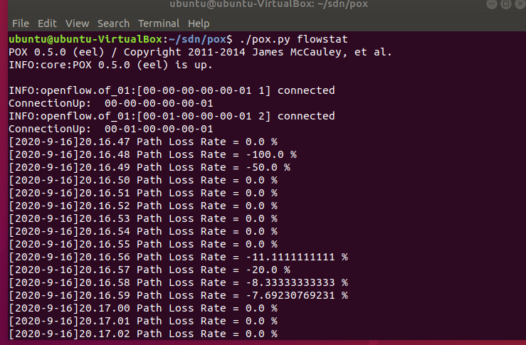 观察 pox 侧的实时状态更新平均丢包率为 0,结果符合 Mininet 脚本中设置的损耗率,也有可能出现负值,可以认为没有丢包。