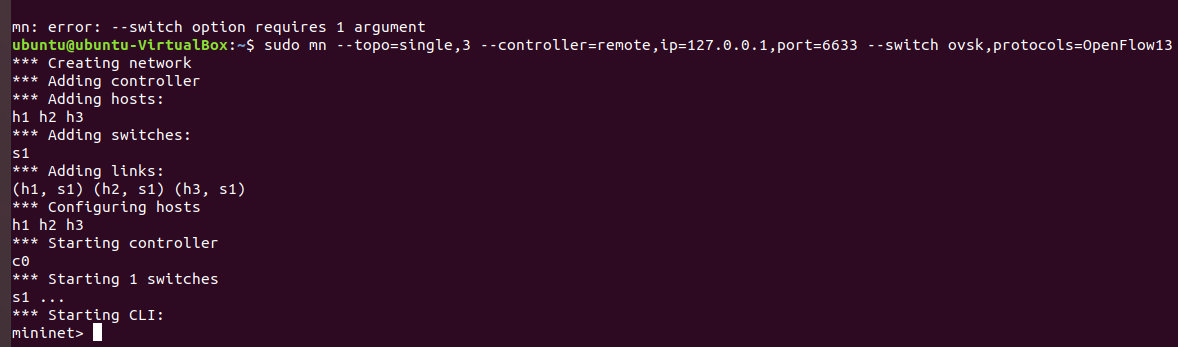 $ sudo mn --topo=single,3 --controller=remote,ip=127.0.0.1,port=6633 --switch