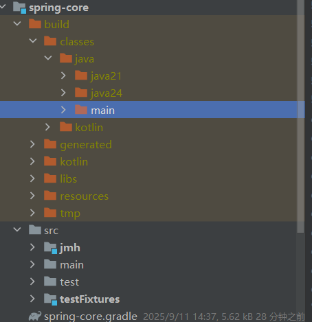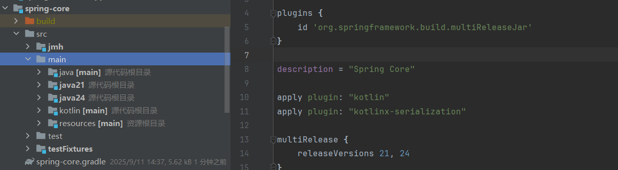 spring-core的源码结构和其他模块都不一样,他是有针对于不同jdk版本分别优化的,查看构建文件即可发现,他引入了multiReleaseJar插件,对源码文件实现了分别目录进行打包.