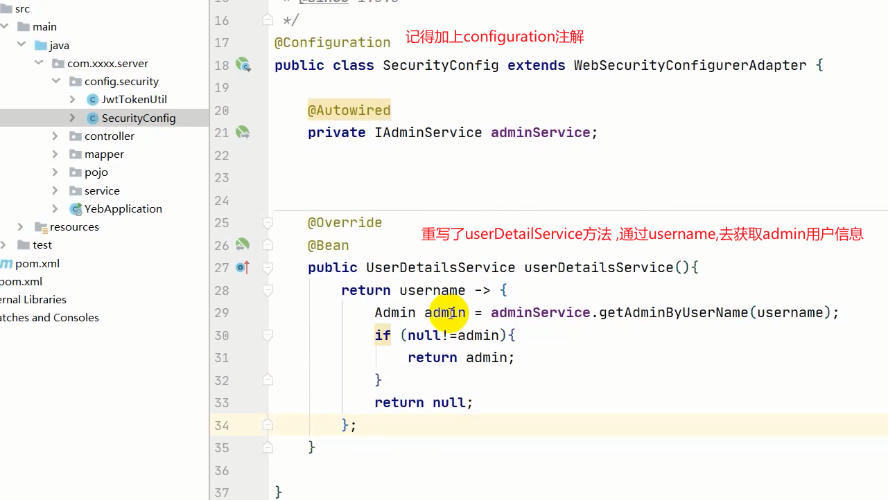 这样就相当于到时候,springcurity会走我们自己重写的userDetailservice,在里面有一个adminService.getAdminByUserName()。这样就可以获取用户名的信息,然后里面的密码匹配我们是通过passwordEncoder去完成的。