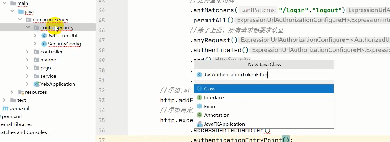 然后,我们需要新建一个登录过滤器。在configsecurity下新建一个JwtAuthencationTokenFilter。