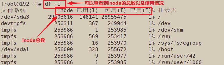 df -i命令可以查看每个硬盘分区的inode总数和已经使用的数量