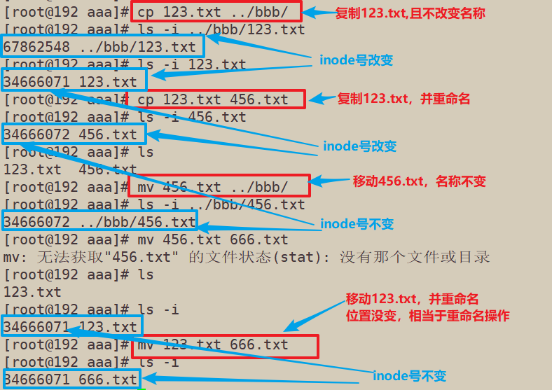 1.11.2.1 移动、复制或者重命名文件,看inode号是否有变化(只有复制文件时inode号会发生改变)