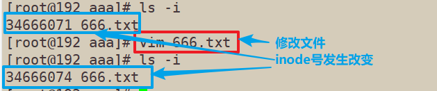 1.11.2.2 修改文件,看inode号是否会改变(修改之后inode号会改变)