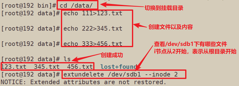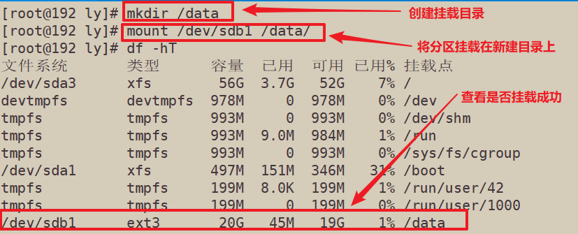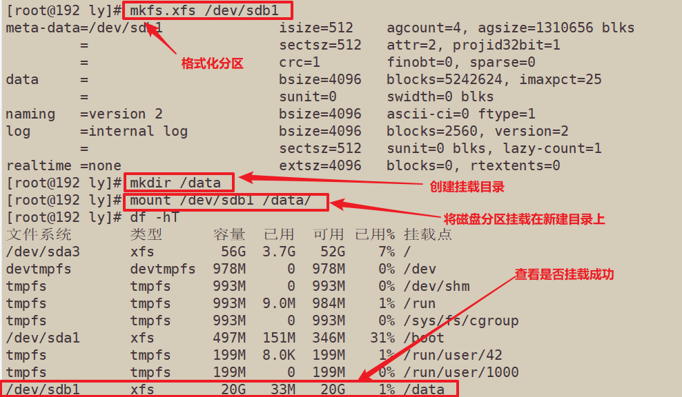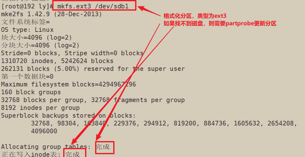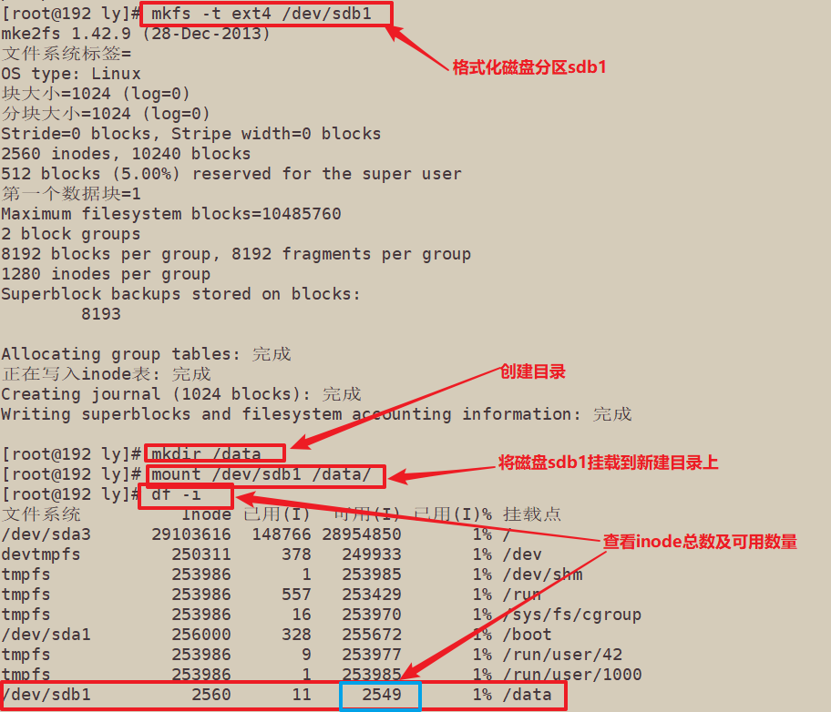 mkfs.ext4 /dev/ sdb1 #也可以用xfs类型,但是在做实验室创建inode号的时候要比inode总数多创建100多个,可能是统计问题,这里建议用ext4或者ext3方便实验