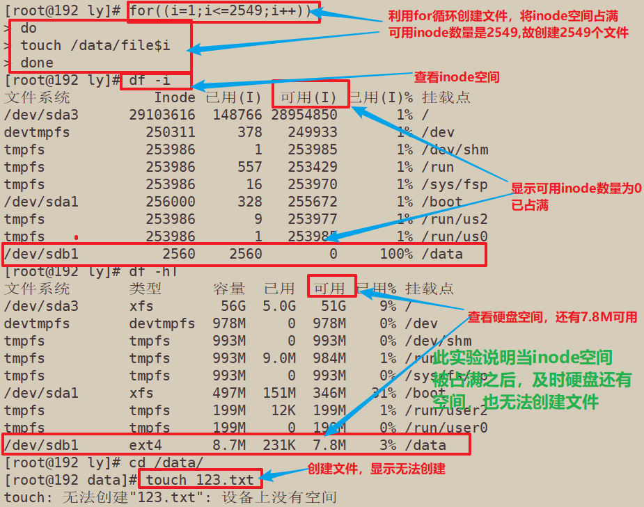 inode也会消耗硬盘空间,当inode的空间消耗完以后,即使硬盘还有空间,也无法使用