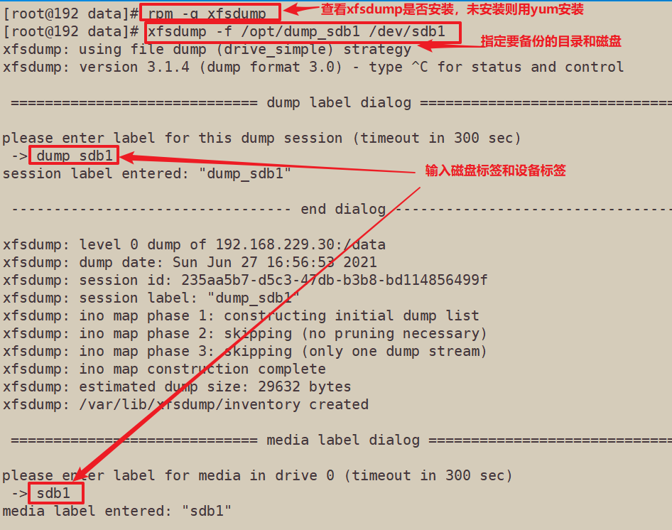 xfsdump -f /opt/dump_sdb1 /dev/sdb1 [-L dump sdb1 -M sdb1 ]