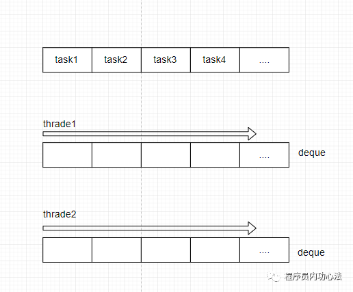 之前的线程池所有的线程共用一个队列,但 ForkJoinPool 线程池中每个线程都有自己独立的任务队列,这个队列是双端队列,如图下所示: