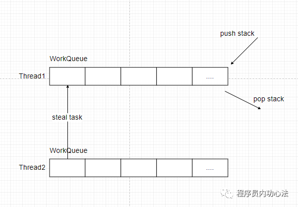 双端队列 deque 中,线程 t1 获取任务的逻辑是后进先出,也就是LIFO(Last In Frist Out),而线程 t0 在“steal”偷线程 t1 的 deque 中的任务的逻辑是先进先出,也就是FIFO(Fast In Frist Out),如图所示,图中很好的描述了两个线程使用双端队列分别获取任务的情景。你可以看到,使用 “work-stealing” 算法和双端队列很好地平衡了各线程的负载。