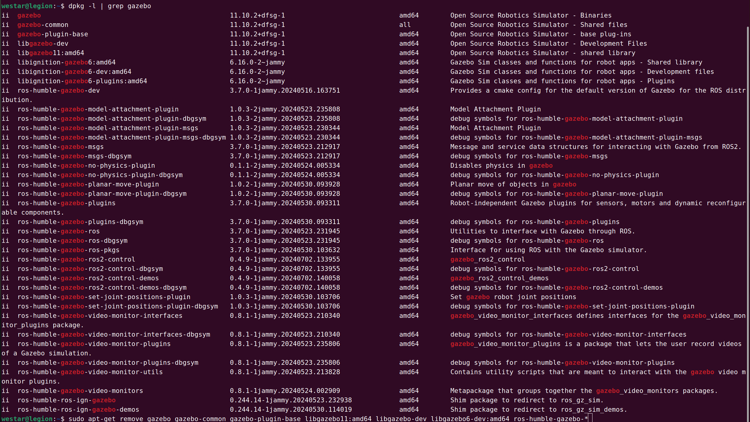 sudo apt-get remove gazebo gazebo-common gazebo-plugin-base libgazebo11:amd64 libgazebo-dev ros-humble-gazebo-* libignition-gazebo6:amd64 libignition-gazebo6-dev:amd64 libignition-gazebo6-plugins:amd64