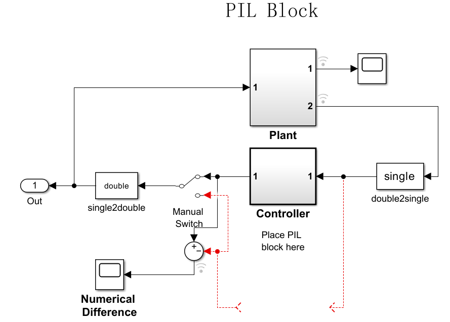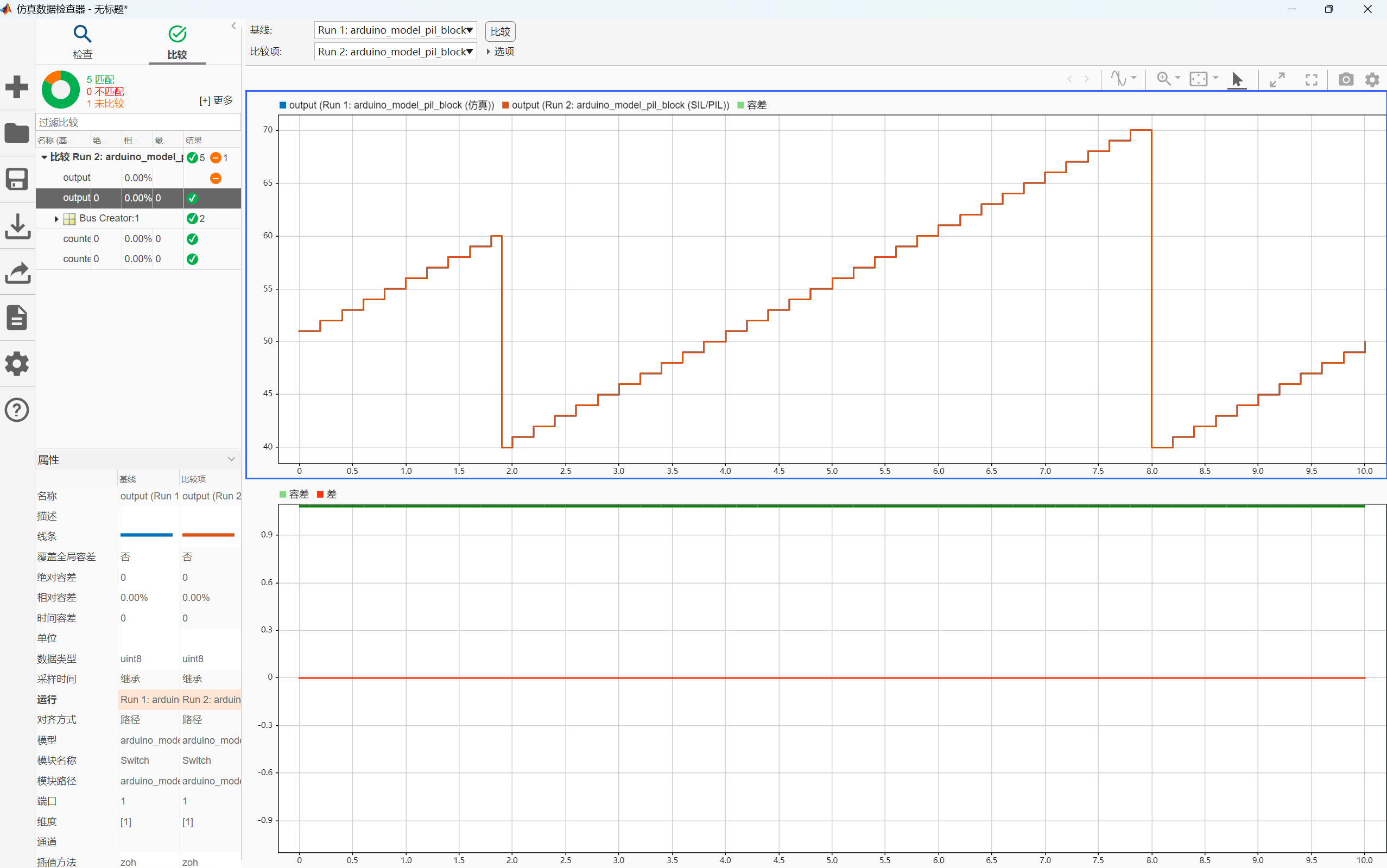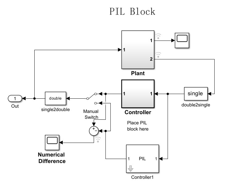 6. 一旦开始模拟模型,PIL 可执行文件开始在 Arduino 硬件上运行。通过双击手动切换模块,可以在原始和 PIL 块子系统之间切换。双击数值差异模块,以查看模拟控制器子系统和在硬件上运行的 PIL 模块之间的差异。