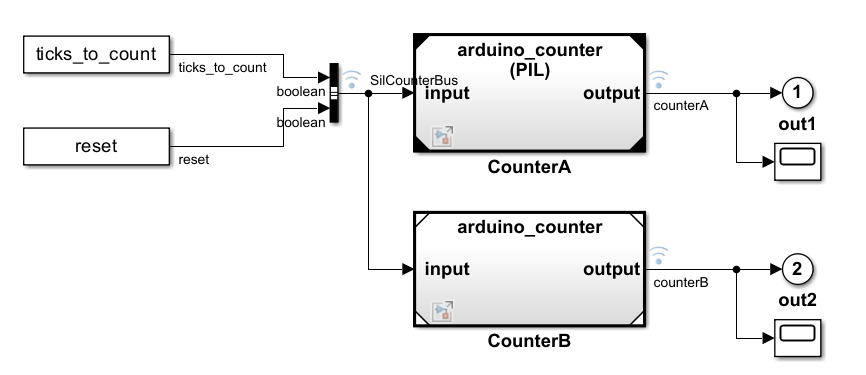 此模型配置用于 Arduino 硬件。该模型包含两个模型块,它们都指向相同的引用模型。您将配置一个模型块以 PIL 模式运行,而另一个将设置为正常模式。