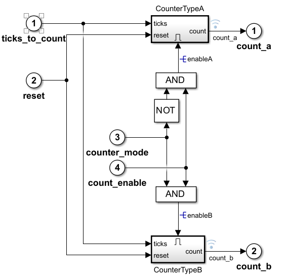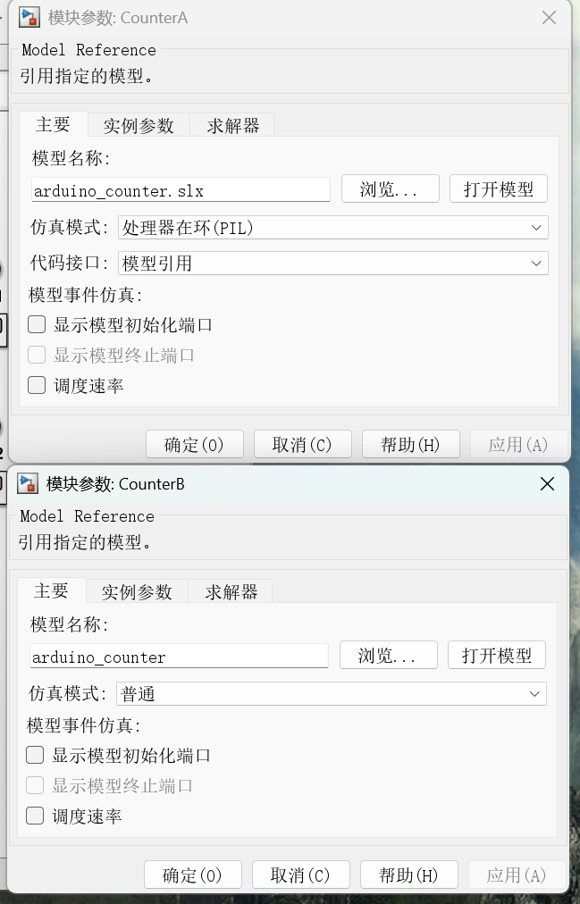 4. 在 PIL 仿真模式下配置并运行 CounterA 模块。要打开 CounterA 模块掩码,右键单击模块并选择模块参数(模型引用)。在功能模块参数:CounterA 对话框中,将仿真模式设置为 Processor-in-the-loop (PIL)