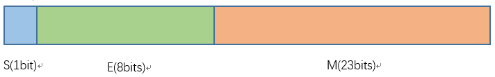 (1)下图为单精度浮点型数据float的存储模型,符号位S在最高位,占用1bit内存,指数位E占用8bits内存,底数部分M占用23bits内存,总共占用4个字节: