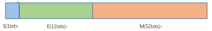(2)下图为双精度浮点型数据double的存储模型,符号位S在最高位,占用1bit内存,指数位E占用11bits内存,底数部分M占用52bits内存,总共占用8个字节:
