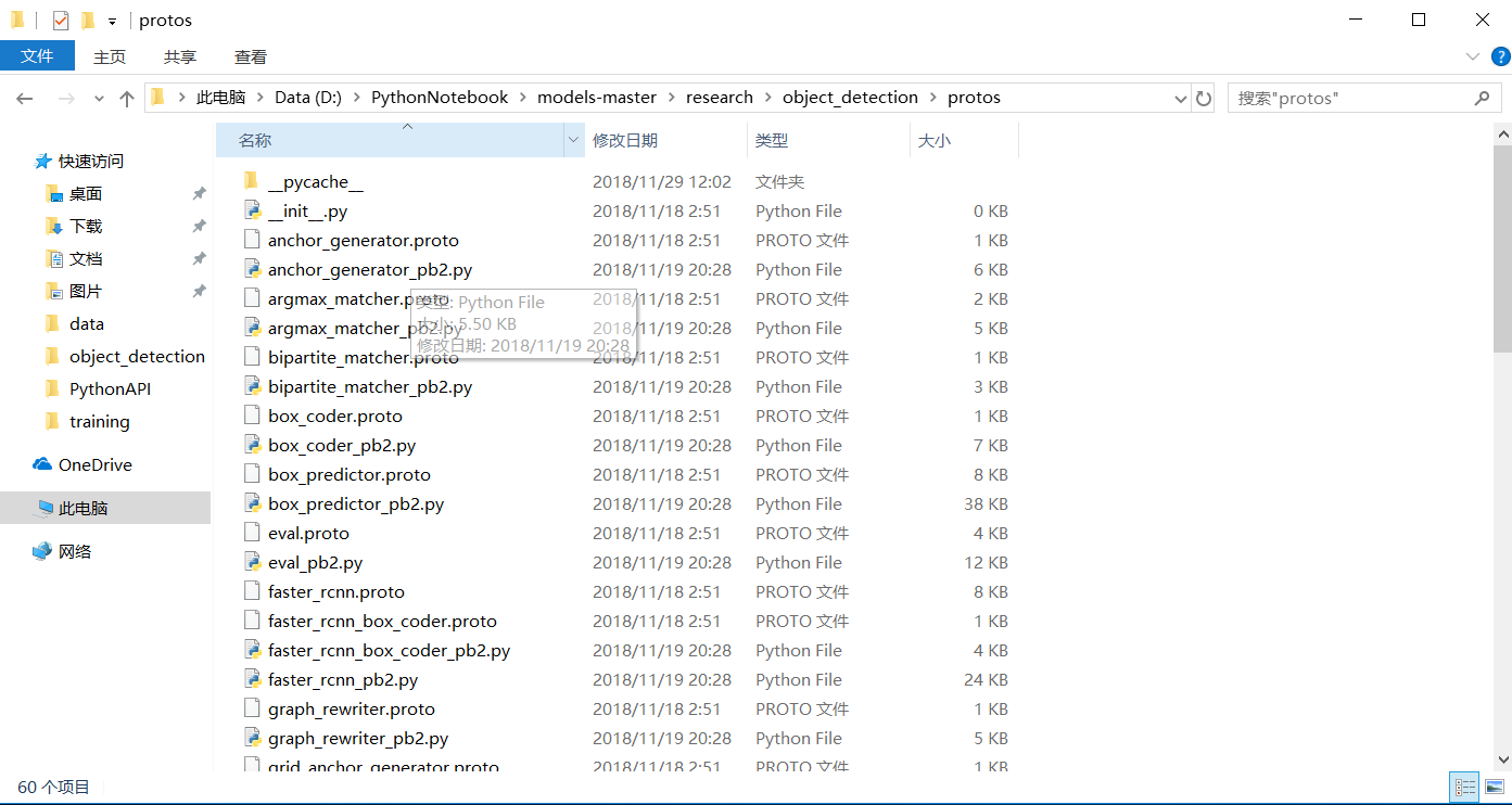 object_detection API使用protobufs来配置模型和训练参数,这将其编译成.py文件些文件以“.proto”的扩展名放在 models-master/research/object_detection/protos下,