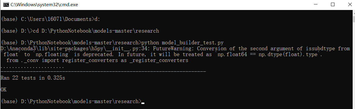 打开Anaconda Prompt,定位到research所在的文件夹,输入python model_builder_test.py,如果出现OK,那么API已经配置成功。