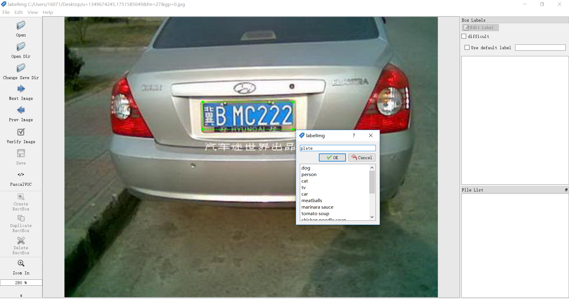 点击Create RectBox,框出车牌,并在labellmg里填上要标注的图片的名称,我写的是plate,点击ok保存,再继续后面的打标签。
