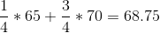 然后就是选取分裂节点,那么对于连续型属性,它的分裂节点是任意相邻的两个取值的中点,我们从第一个开始,取65和70的加权均值: