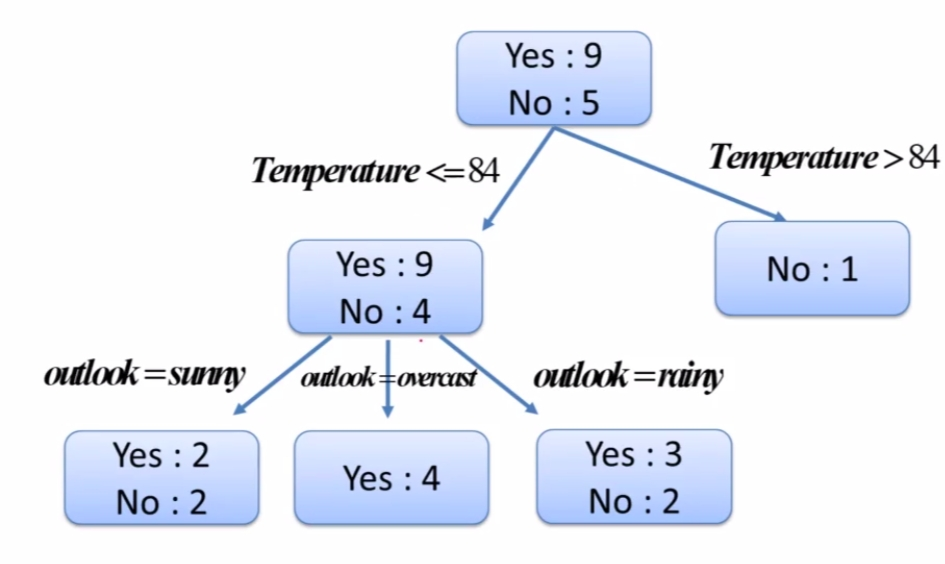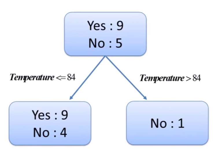 对于Temperature <=84的节点继续进行分裂,只不过分裂的时候去掉Temperature属性以及Temperature>84的节点里的样本,重复上面步骤。