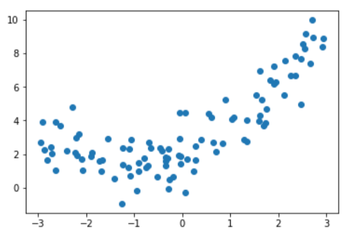 1 import numpy as np 2 import matplotlib.pyplot as plt 3 x = np.random.uniform(-3,3,size=100) 4 X = x.reshape(-1,1) 5 y = 0.5 * x**2 + x + 2 + np.random.normal(0,1,100)