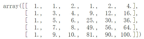 1 from sklearn.preprocessing import PolynomialFeatures 2 X = np.arange(1,11).reshape(-1,2) 3 poly = PolynomialFeatures(degree=2) 4 poly.fit(X) 5 X2 = poly.transform(X)