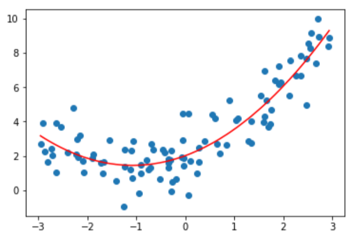 1 poly_reg.fit(X,y) 2 y_predict = poly_reg.predict(X) 3 plt.scatter(x,y) 4 plt.plot(np.sort(x),y_predict[np.argsort(x)],color='r') 5 plt.show()