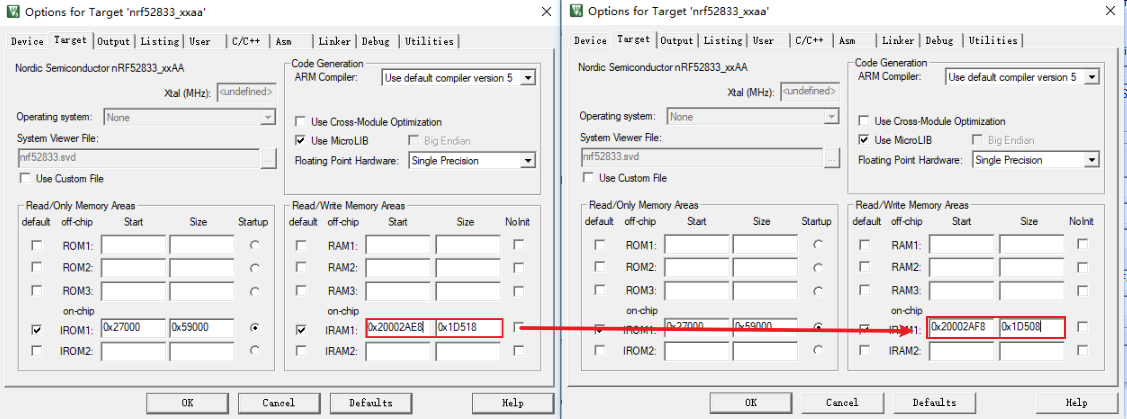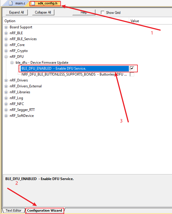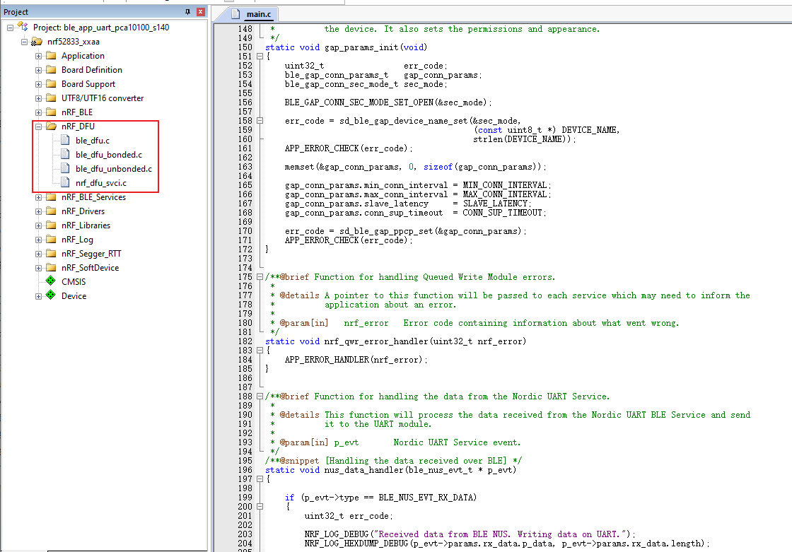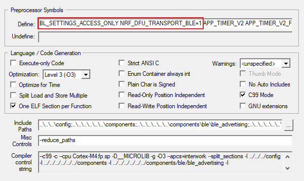 在工程设置选项下 C/C++选项下: Preprocessor Symbols 中添加这两个定义 NRF_DFU_TRANSPORT_BLE=1 BL_SETTINGS_ACCESS_ONLY