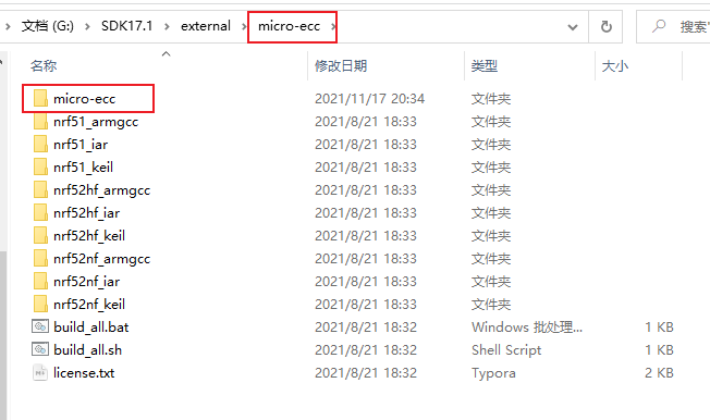 把下载的 micro-ecc-master.zip 解压, 解压后拷贝到 SDK/external/micro-ecc 文件中, 重新名为 micro-ecc, 如下图所示: