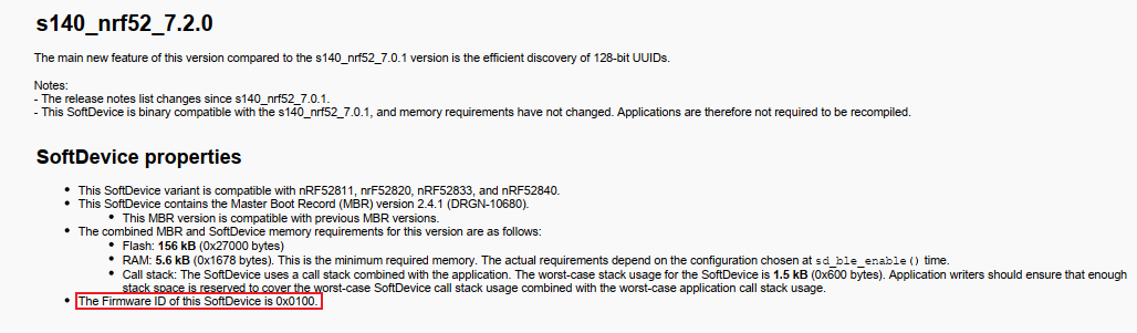 协议栈:升级包的时候回用到它的版本号,可在通过命令行的命令(nrfutil pkg generate --help)查看、在线文档、官方论坛搜索,也可以在SDK的协议栈版本的doc信息中查看(SDK\components\softdevice\s140\doc\s140_nrf52_7.2.0_release-notes.pdf)