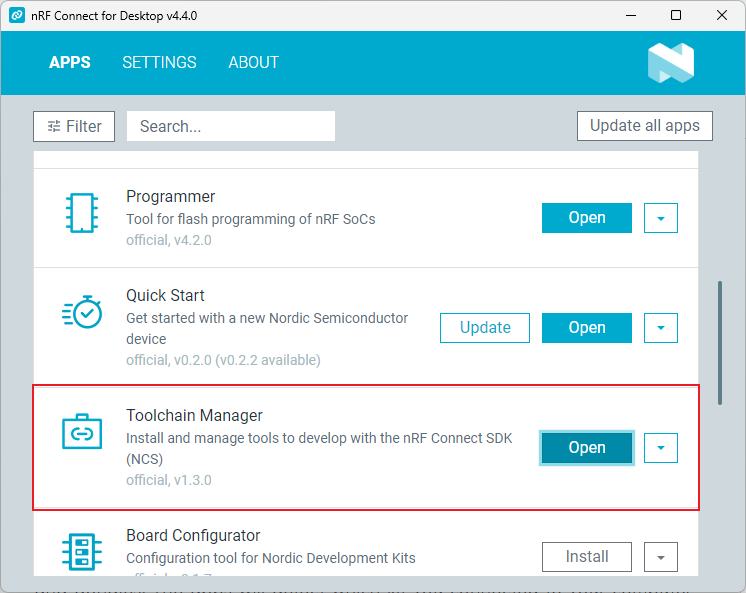 nRF Connect for Desktop是一个跨平台工具框架,用于协助nRF设备的开发。它包含许多应用程序来测试,监控,测量,优化和编程您的应用程序。nRF Connect for Desktop旨在与我们的开发套件和加密狗一起使用。应用程序将检测您连接到计算机的套件并上传所需的固件。