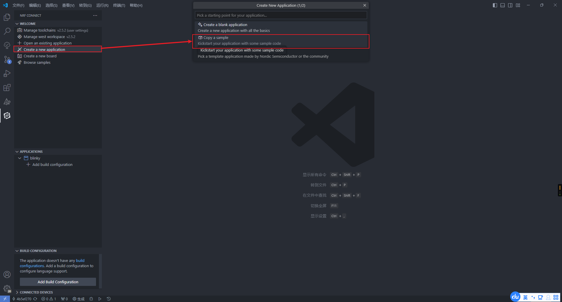 创建工程,可以直接使用NCS的SDK所在的文件夹样例,也可以复制到新的文件夹下。